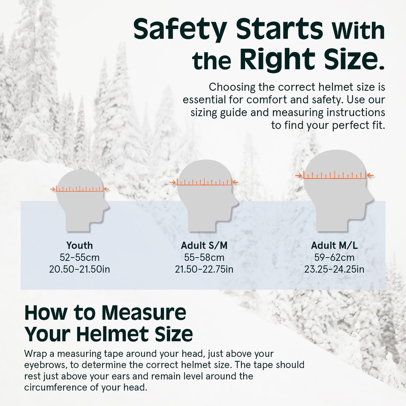 - SIZING GUIDANCE - To determine the correct adult ski helmet or youth ski helmet size, wrap a measuring tape around your head. The tape should rest just above your ears and remain level around the circumference of your head. S: 52-55 cm, M: 55-58 cm, L: 59-62 cm