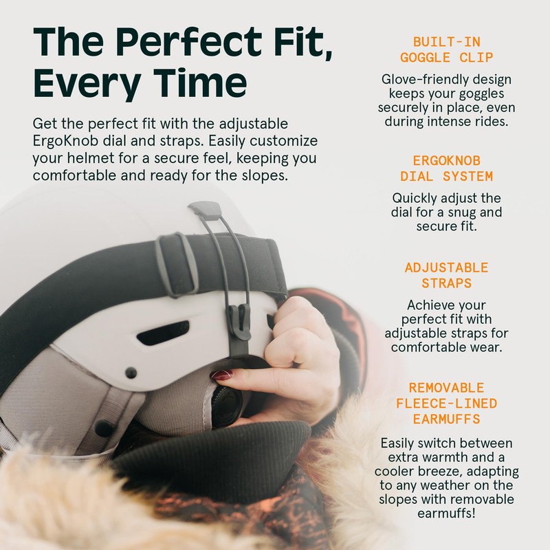 - ADJUSTABLE FIT: The adjustable ErgoKnob dial to perfectly customize your fit. Tighten it up and remove plush earmuffs for warmer days or loosen it if you need to toss a beanie underneath on chillier descents.
