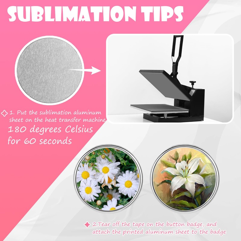 - Design Your Own Pins: you can use a sublimation printer to combine your photos with these aluminum sheets, then teal away the film on the top of the blank pinback buttons, attach the sublimated aluminum sheet to the pin to get your work down, creating your own pins for various purposes