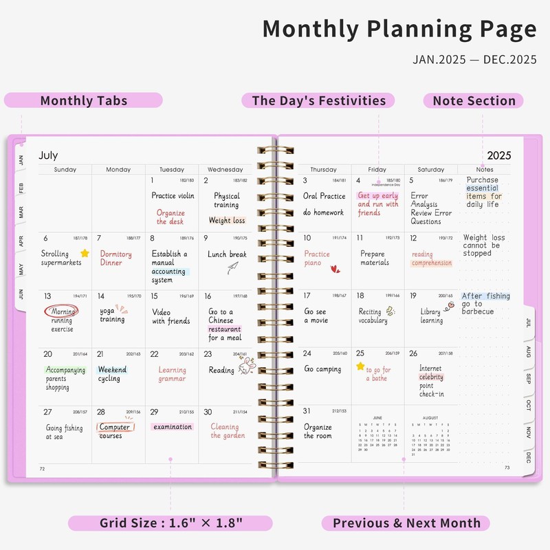 - MONTHLY PLANNING: Each monthly section contains Current & Remaining Days + Festival of the Day + Previous & Next Monthly Preview + Note Section. It can provide enough writing space for you to organize better life organization