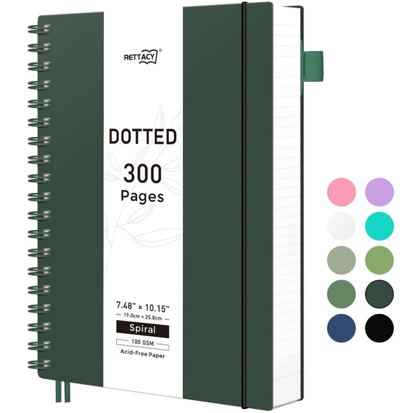 RETTACY Bullet Dotted Journal Notebook, 300 Pages, B5 Medium Size (7.4'' × 10''), 100 GSM Thick Paper, Flexible Plastic Cover, Spiral-bound, for Bullet Journaling, Planning, Tracking (Deep Green)