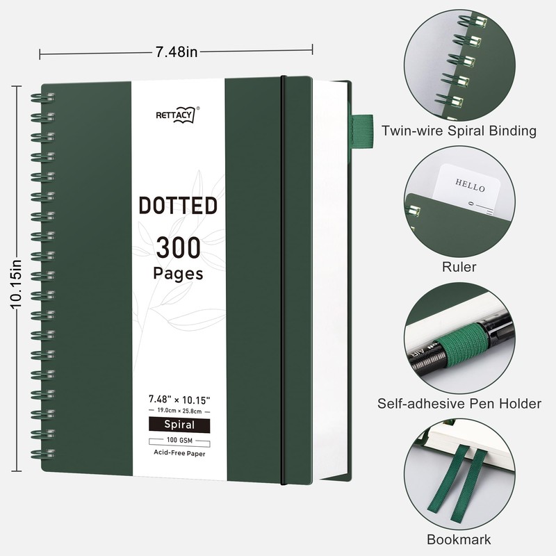 - TWIN-WIRE SPIRAL BOUND: RETTACY Bullet Dotted Journal features a sturdy twin-wire spiral bound, easy page turning as well as the ability to lay flat at 180°. The cover is made of PVC plastic which is waterproof and provides protection for your valuable notes
