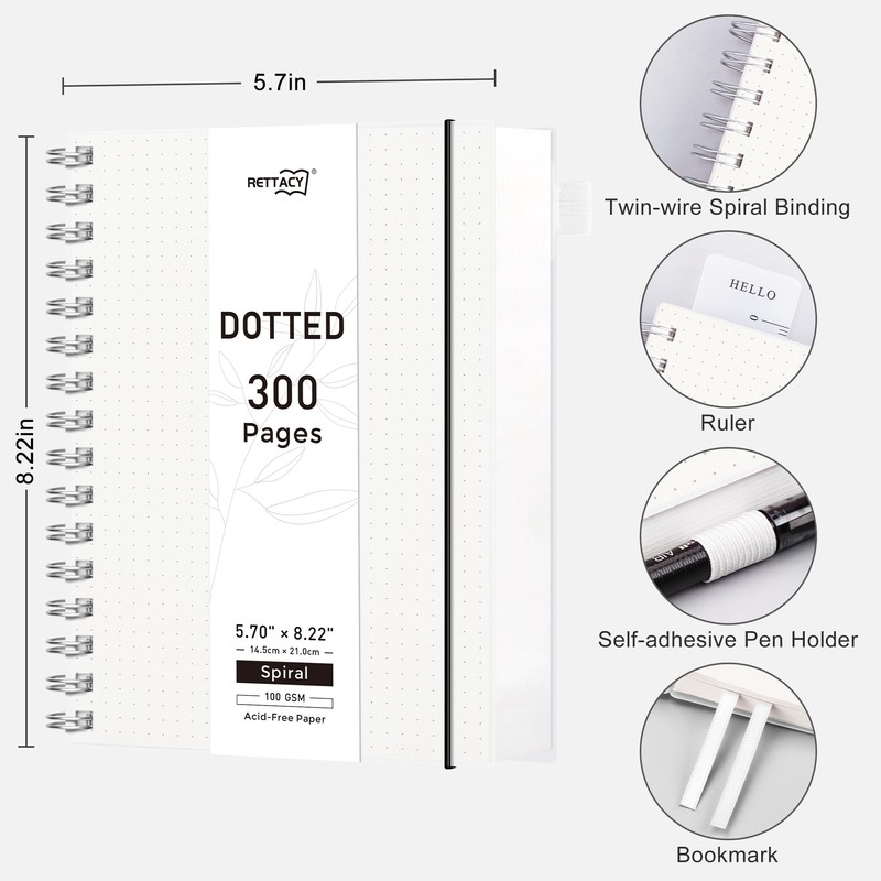 - 1 A5 spiral notebook: The A5 size (14.5 x 21 cm) notebook comes with 150 sheets/300 pages of dotted paper, it offers plenty of space for you to write.