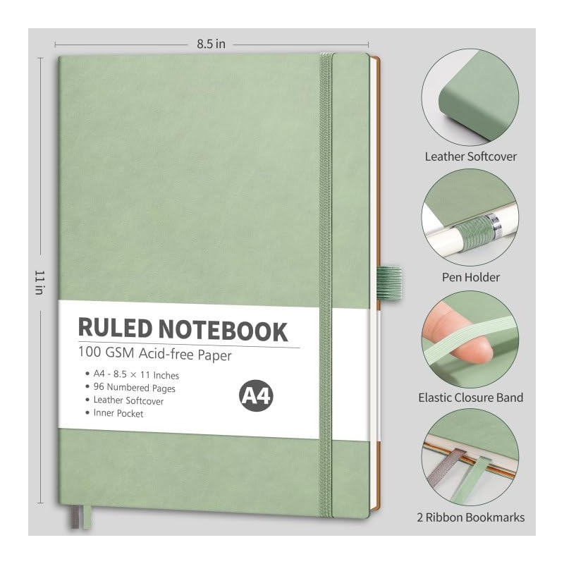 RETTACY Notebook Lined A4, Lightweight Journal Diary with 96 Numbered Pages, 100 gsm Notebooks, Inner Pocket, Soft Cover for Office, School, Work, Women, Men, 21.5 x 27.9 cm - Light Green