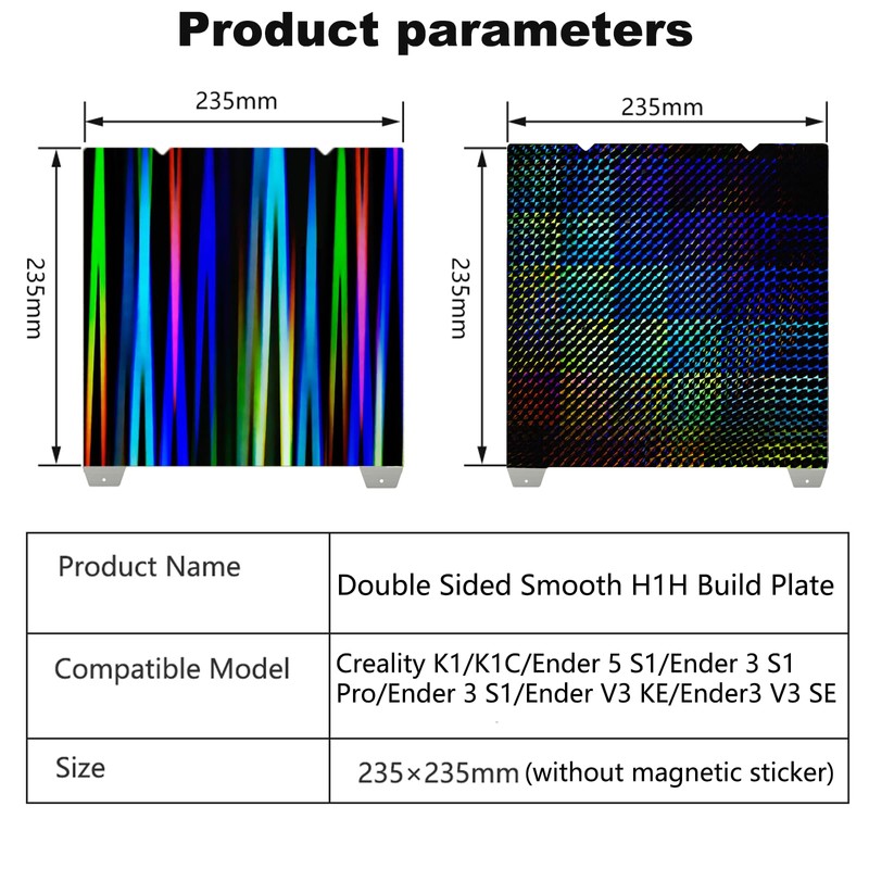 - 【Compatible Printer】235x235mm Double sided H1H surface spring steel sheet with 2 holes, compatible with Ender 3 Neo/Ender 3 V2 Neo/Ender 3 S1/Ender 5 S1/Ender 3 V3/Ender 3 V3 SE/Ender 3 V3 KE/K1/K1C CR-20/ CR-20 Pro/ Voxelab Aquila/Voxelab Aquila C1/ Voxelab Aquila C2, and other similarly-sized FDM 3D printers.