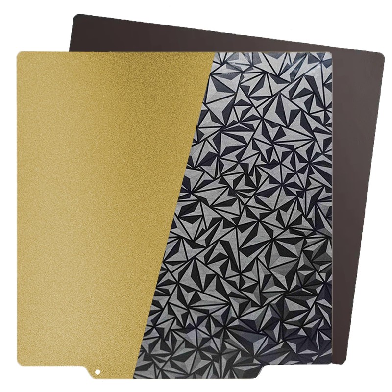 - 【Upgraded Double Sided Printing】Double-sided PEO+PEI spring steel plate , one side is smooth diamond type print surface--upgraded PEO film. The other side is PEI frosted surface, presenting the frosted sticker surface a distinctive frosted touch, provides greater adherence to the model and prints without warping.