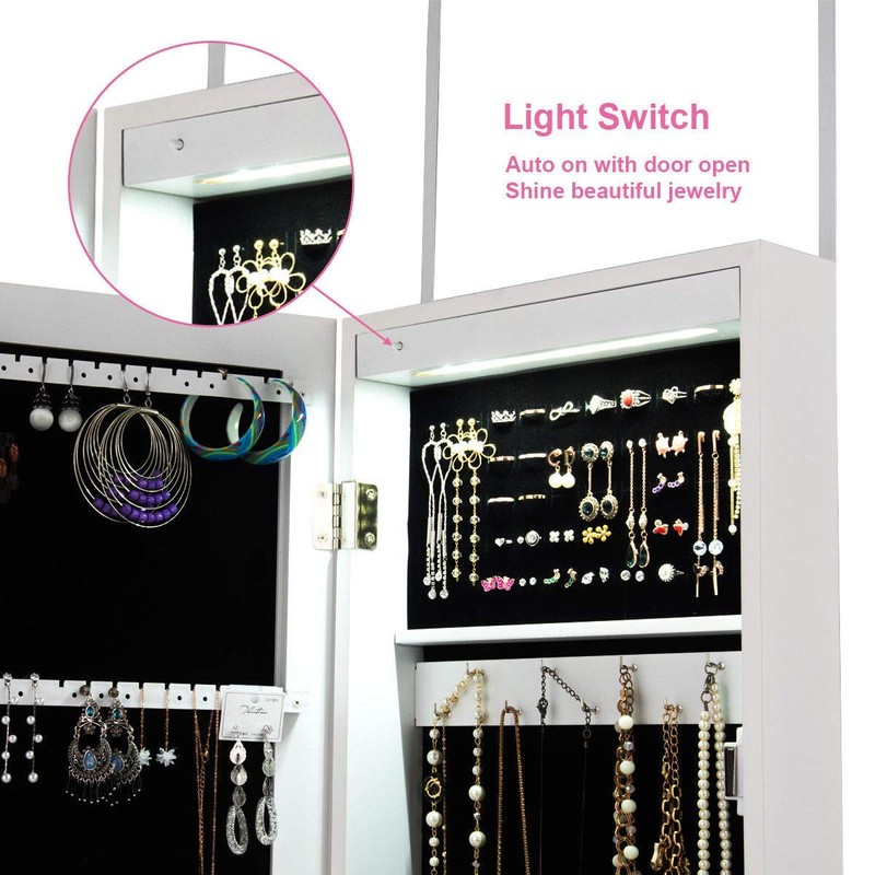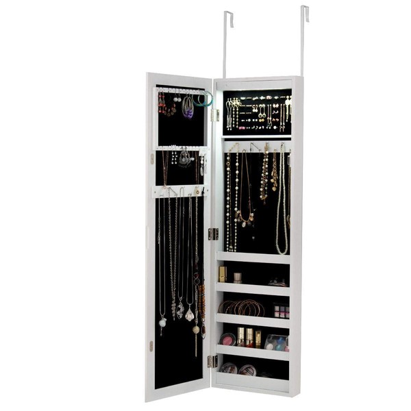 * Made of premium MDF board, durable and stable * Painting coated, moisture and corrosion resistant * Oxidation resisting velvet liner prevents your jewelries from being scuffed and scratched * Full size mirror is convenient for you to try your clothes or jewelry on * Features beautiful LED lights, make your jewelry more dazzling * Helps your jewelry in an organized manner and prevents them from getting tangled * Door mounted or wall mounted for saving more space * 3AAA batteries not included * Easy to assemble & easy to clean ** Specifications**