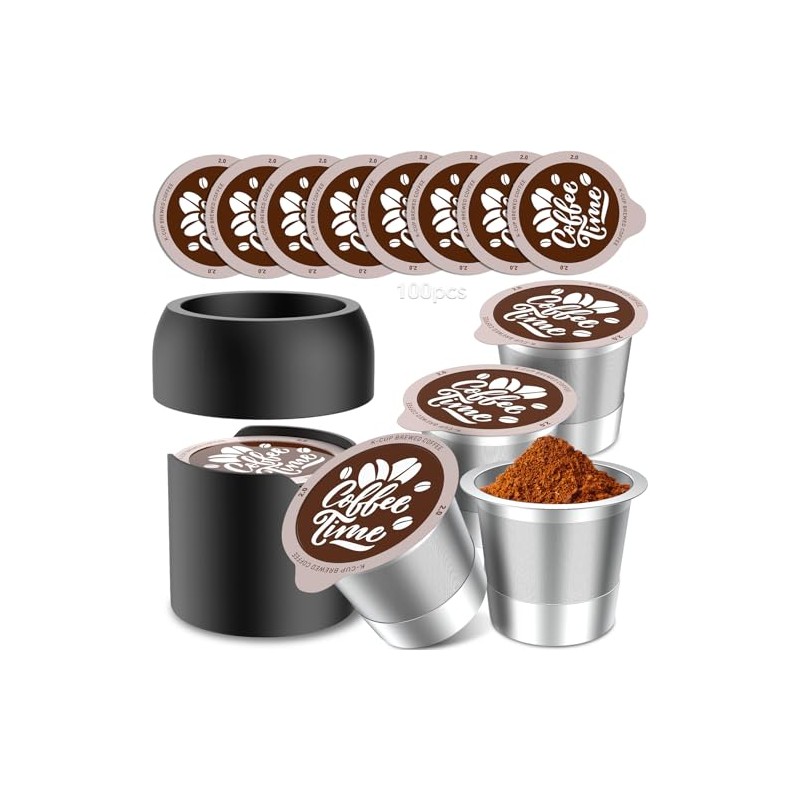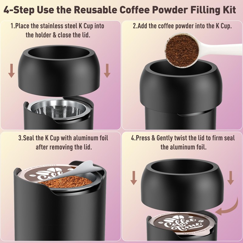 - Reusable K Cups for Kit:The Reusable Capsule Kit includes:1 Holder,4 Stainless Steel K Cups,100 Food-Grade Aluminum Foil Seals.The reusable K cup holder precisely positions the aluminum seal, creating a perfect seal with just one lid. This makes refilling quick and easy.