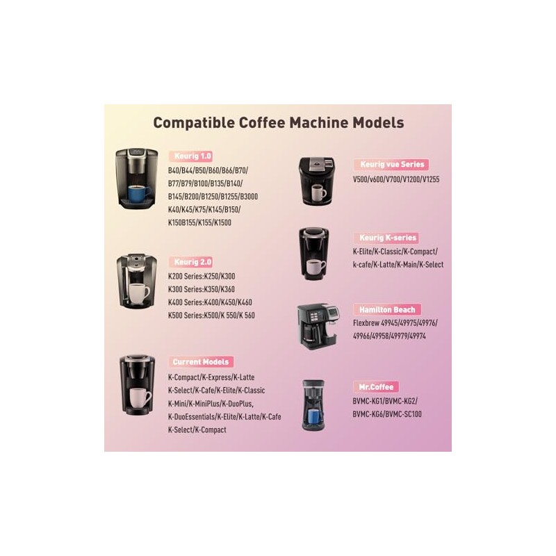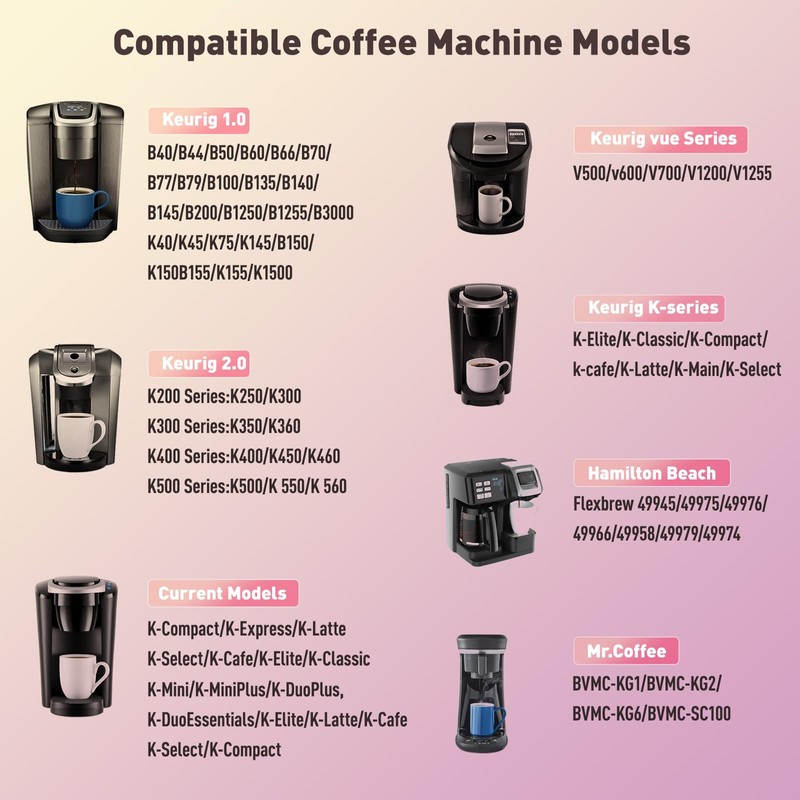 - Our reusable coffee pods are compatible with 2.0 and 1.0 Coffee Makers, K-Mini, K-Express, K-Classic, K-Elite, K-Latte, K-Cafe, K-Select, K-Compact, K-Duo Gen1, B40/B40/K45, B44/B50/B60, B66/B70/K75, B77/B79/B100, B135/B140/B145, K145/B150/K150, B155/K155/B200, B1250/B1255/B3000, K1500, Breville K-Cup, Mr. Coffee K-Cup.