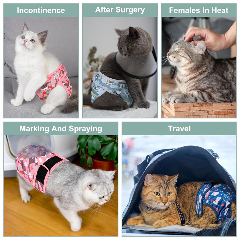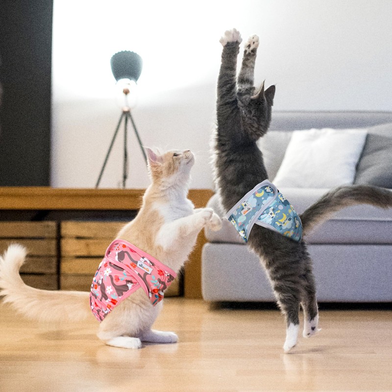 - Reusable and Adorable: There are 3 kitten diapers in a pack, so you can be sure your cat always has clean diapers to wear. And these kitty diapers are reusable, just wash and dry them and use them again, now you can save a lot of money on those disposable diapers. These three diapers come in three different patterns, your cat will love these and your mood will change when you see your cute cat in these adorable cat diapers for female cats