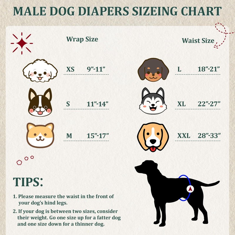 • Breathable and Comfortable: The lining surface of this male dog wrap is made of breathable and soft knitted fabric, which is skin-friendly and comfortable for your pet to wear without burden. The khaki-colored lining allows you to check your dog's urination in time and protects your puppy male dog's nappy from urine stains, which can affect the aesthetics and prolong the service life. The ones with shrink-stretch edges can fit the waistline and increase wearing comfort.