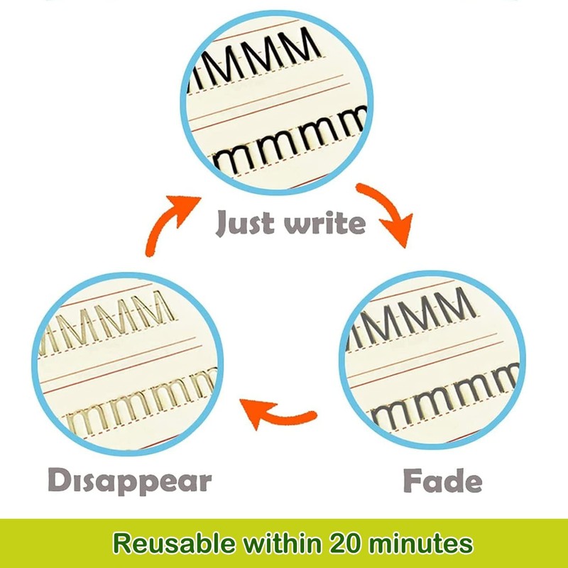 - The matching refills use magic ink,handwriting will automatically fade and disappear within 30 minutes after writing, great for repeated practice. It is a Must Have handwriting copybook set for your kids learning calligraphy.