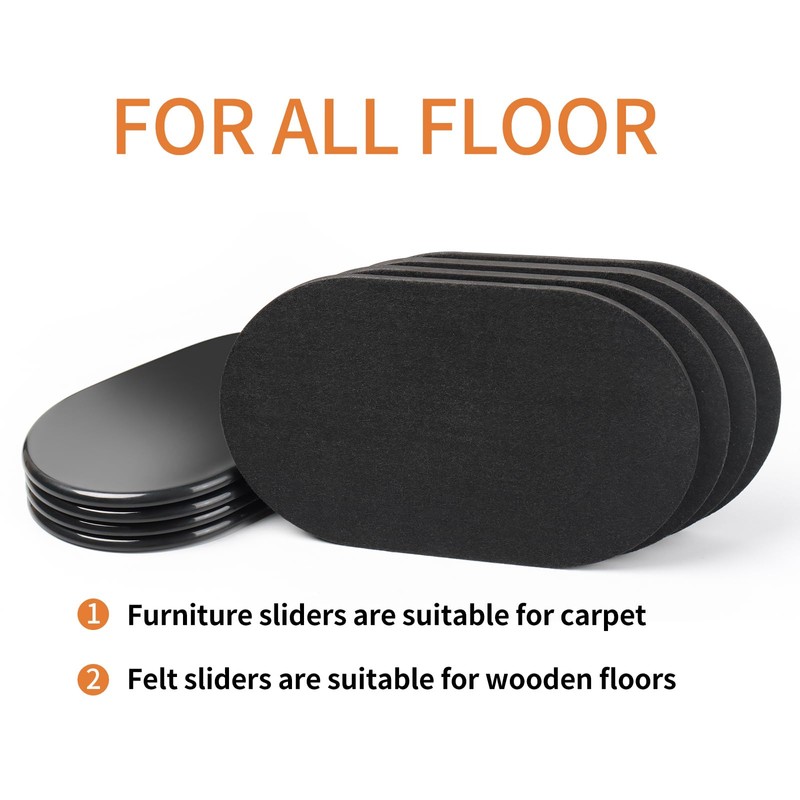 - ➤【Furniture Movers for All Surfaces】- 4 pieces smooth surface furniture gliders are suitable for carpets, and 4 pieces felt sliders are suitable for hard floors. 8 pieces multi-surface sliders are suitable for a variety of furniture, such as refrigerators, sofas, beds, pianos, bookcase, wardrobe, tables, display shelf, piano and any other large or difficult household/office items.