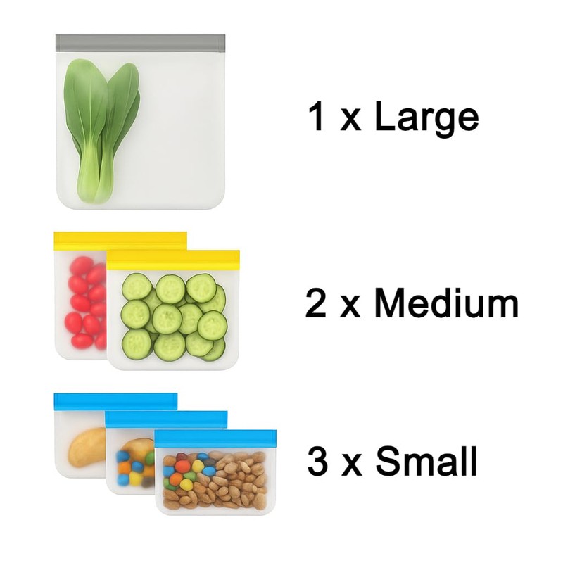Reusable PEVA Food Storage Bags (6-Pack) – Leakproof, BPA-Free, Eco-Friendly Freezer Bags for Sandwich, Fruit, Veggies & Meal Prep – 3 Small(S), 2 Medium(M), 1 Large(L)