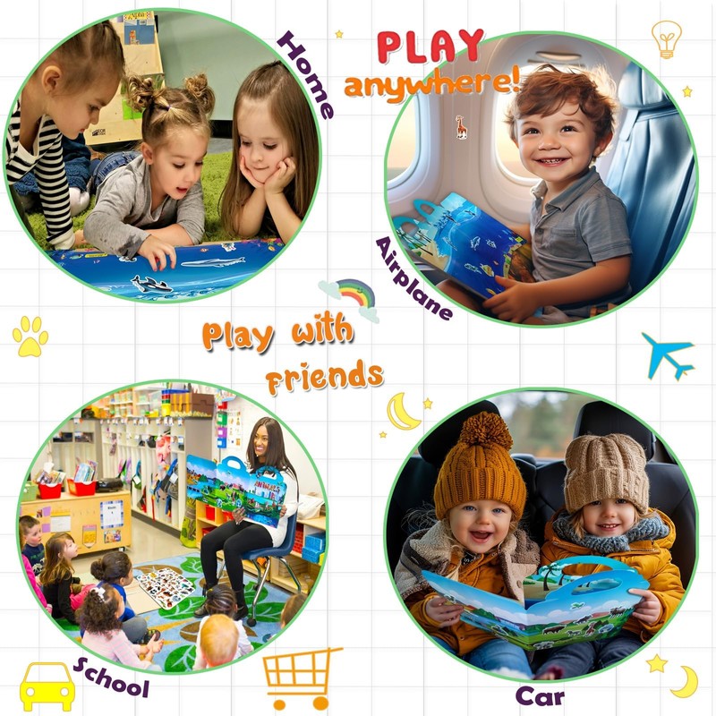 - ✈️【IDEAL STICKERS FOR TODDLER'S TRAVEL ACTIVITIES】All stickers have colorful words that parents can interact with kids, Babies around 2 years old are very fond of imitating the sounds of adults, and that scene is nostalgic; The size and handle design of the sticker book are very suitable for the journey, whether it is a car, train, plane, ship, etc., children will enjoy the fun of the game during the trip.