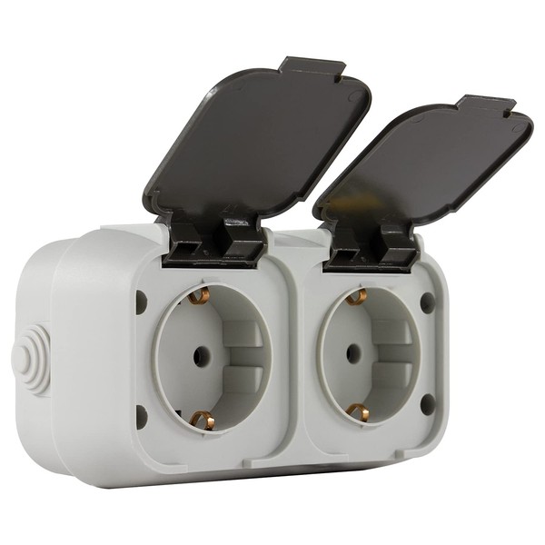 Die Doppelsteckdose hat zwei dunkelgraue Klappdeckel, welche vor Feuchtigkeit schtzen. Bestens geeignet fr die Verwendung von IPx4 Winkelsteckern im Aussenbereich. Im Geh?use sind oben, unten und seitlich bereits Aussparungen vorhanden, durch die ein Kabel gefhrt werden kann. Eine Gummidichtung (au?er unten) schtzt den Innenraum vor Staub und Feuchtigkeit. Lieferumfang: Doppelsteckdose fr Feuchtr?ume und Montageanleitung fr waagrechte Montage. Technische Details der Feuchtraum-Steckdose: maximale Belastbarkeit 3680W, 230V~/50 Hz,16A. Mit Schutzleiter. Farbe: grau-dunkelgrau. Abmessungen Doppelsteckdose (HxBxT): 72 x 153 x 58 mm. Gewicht 179g.