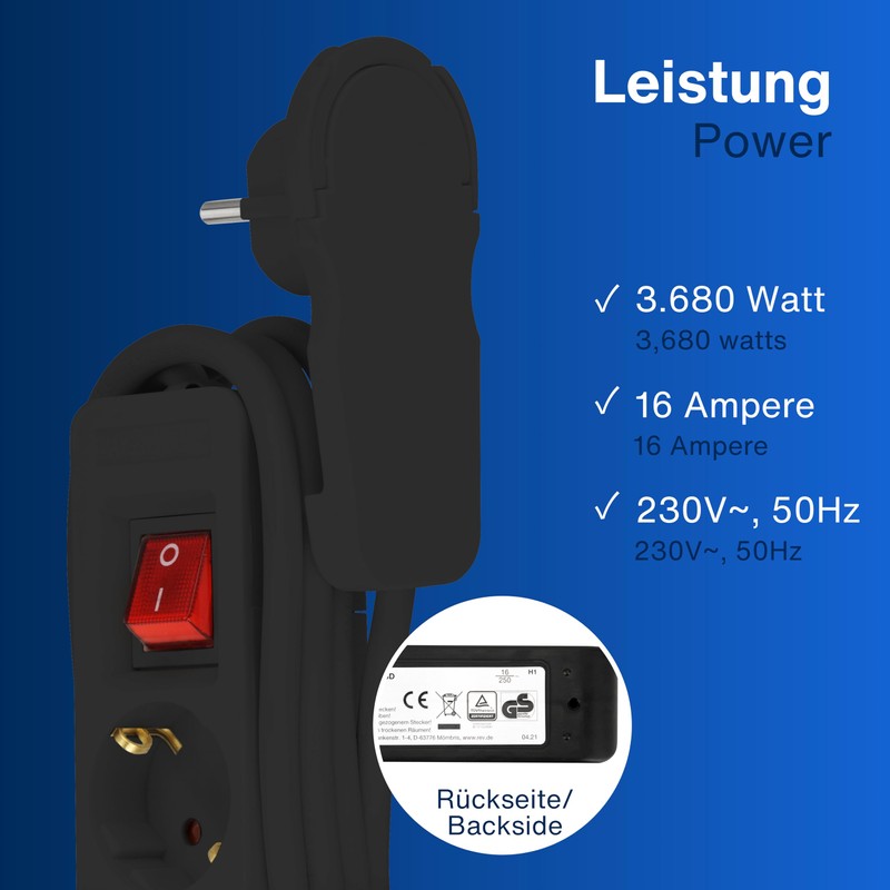 Robuste 3fach Steckdosenleiste: Kompaktes Geh?use aus schlagz?hem Kunststoff - perfekt fr den Einsatz zu Hause oder im Bro. Bequeme Handhabung: Die Steckerleiste verfgt ber einen Flachstecker (8mm) mit ausklappbarem Griff zum einfachen Herausziehen - ideal fr enge Bereiche hinter Schr?nken, Regalen, Kommoden etc.. Auf Knopfdruck Strom sparen: Der Mehrfachsteckdose verfgt ber einen beleuchteten, zweipoligen Ein-/Ausschalter, der es Ihnen erm?glicht, mit nur einem Knopfdruck alle Ger?te auszuschalten. Steckdosen im 45 Winkel: Die Steckdosen sind im praktischen 45 Grad Winkel angeordnet, um eine problemlose Aufnahme von mehreren Schutzkontakt- und Winkelsteckern zu erm?glichen. Weitere Details: Steckdosenverteiler mit 2 m Kabel (H05VV-F 3G1,5mm2). Max. Belastbarkeit 3680W, 230V~, 50Hz, 16A. Verwendung im Innenbereich (IP20). Abm. (LxBxH): 200 x 47 x 41mm. Gewicht: 376g