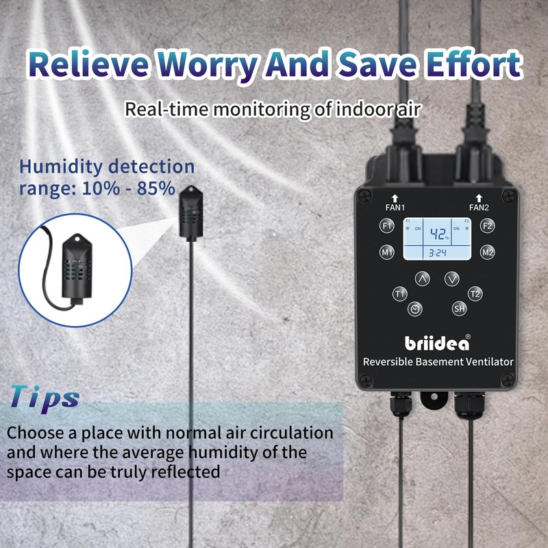 - VERSATILE APPLICATIONS: Reversible Basement Ventilation Fan features a built-in controller with humidity, timer, and speed settings. No extra devices needed. Easy to use and cost-saving, ideal for basements, storage rooms, and other damp spaces