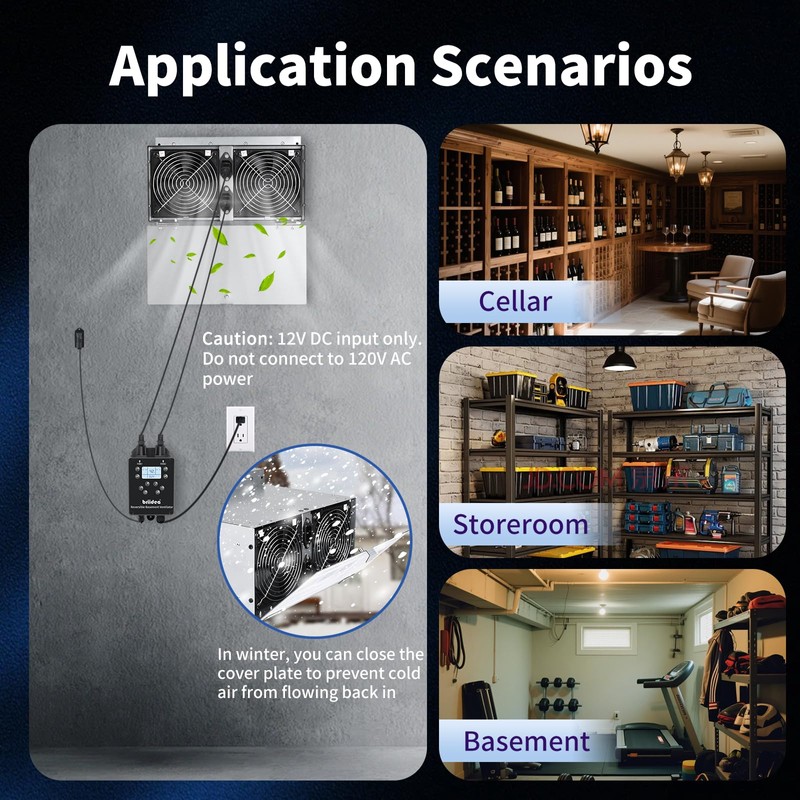 - REVERSIBLE DUAL FAN DESIGN: Reversible Basement Ventilation Fan features two independently controlled fans with easy reverse function. It can quickly exhaust indoor air or bring in fresh outdoor air for balanced ventilation CAUTION: 12V DC INPUT ONLY. DO NOT CONNECT TO 120V AC POWER