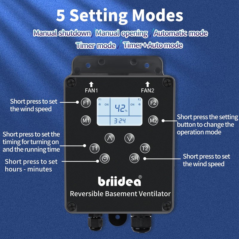- SMART CONTROL: Reversible Basement Ventilation Fan equipped with an intelligent controller that shows real-time humidity, fan speed, and working status. Offers five modes to easily adjust ventilation time and humidity for precise air quality control