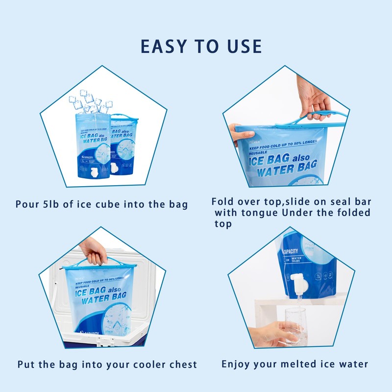 - Portable Cooler: Different from other ice bags made of gel or water that need to be frozen, our cooler ice pack can be directly used when filled with ice cubes, which is so simple. The sturdy handle can be used to pick up refillable ice pack at any time. When the cooling effect of the ice pack weakens, all you need to do is add ice!