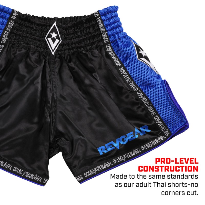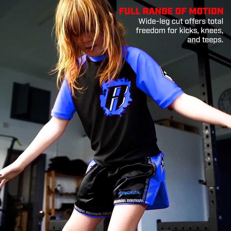 - Revgears Muay Thai shorts for kids feature a comfortable fit, allowing unrestricted movement during grappling, striking, and other martial arts activities.