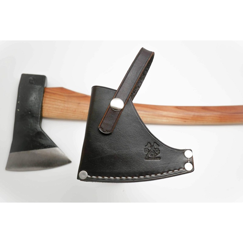 - The sheath is then glued, hand stitched and rivets are placed at the corners to reinforce the body. The axe head blade, when placed in the sheath, is prevented from touching the rivets because of the welt. The retention strap is then secured with a rivet and a snap is added for easy on/off action.