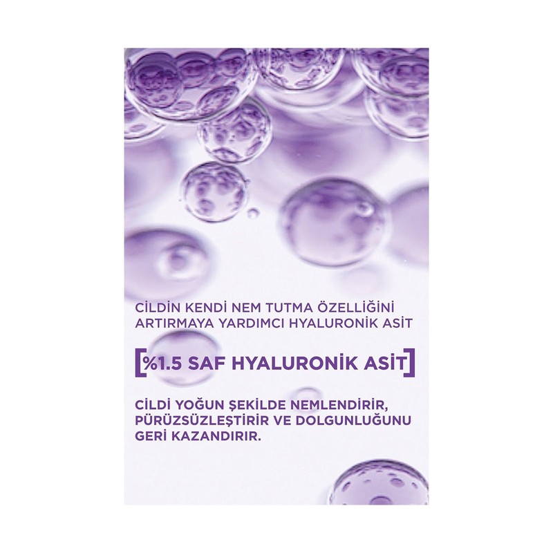 Dermatologlar Tarafından Onaylanan* Dünyanın 1 Numaralı Yaşlanma Karşıtı Serumu** En Yüksek Hyaluronik Asit Konsantrasyonumuz***B elirgin Şekilde NemlendirirPürüzsüzleştirirDolgunlaştırarak-%47**** Oranında Kırışıklık Görünümünü Azaltır Dolgun, genç görünümlü v e esnek bir cilt için cilde nemini geri kazandırır.ANINDA:Cildi yoğun şekilde nemlendirir. Cilde daha dolgun ve esnek bir his ve pür üzsüz bir görünüm kazandırır. 1 HAFTADA:Cilt dolgunluğunu geri kazandırır, daha sıkı ve gergin hissedilir. Günden Güne Azalan Kırış ıklık Görünümü****:2 haftada -%14, 4 haftada -%31, 6 haftada -%47 oranında kırışıklık görünümü azalır Temizlenip kurulanmış yüz v e boyun bölgenize günde 2 defa 2-3 damla uygulayın. Uyguladıktan sonra kreminizi sürebilirsiniz. *Şubat 2021de sona eren 12 aylık"Mesafeli Satış Sözleşmemiz uyarınca; toptan veya yeniden satış amaçlı oluşturulduğu tespit edilen siparişler ile ürün, hizmet ve indirimlerimizden tüm müşterilerimizin faydalanabilmesi ve stokçuluğun engellenmesi için 6 adetin üzerindeki doğrudan ve dolaylı siparişleri Eve’in iptal hakkı saklıdır."