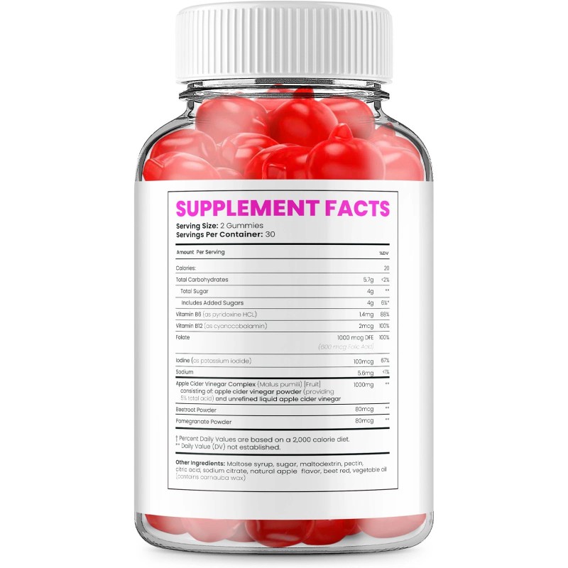 - Ingredients: Apple, Apple Cider Vinegar, Citric Acid, Iodine, Pectin, Pomegranate, Red Beet, Vitamin B12, Vitamin B6