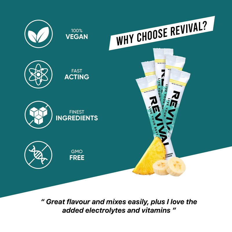 - Revival Super Greens & Vitamins – The worlds first single serve super green supplement with added electrolytes. Our formula provides you with your daily greens with added vitamins & minerals. Simply mix with 300ml of water and drink.