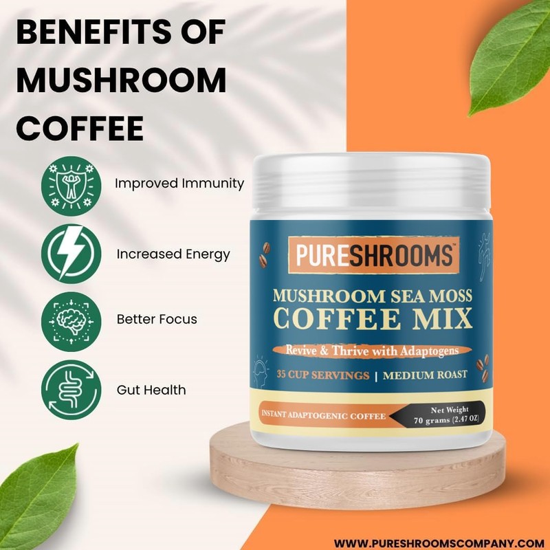 - Stir Your Way to Gut Glory & Skin Splendor! A cup of PureShrooms Coffee Mix is your ticket to gut health and skin radiance. Enjoy the power of sea moss for smooth digestion and skin that says "Hello, Gorgeous!" every day. It's your wellness, all brewed up!