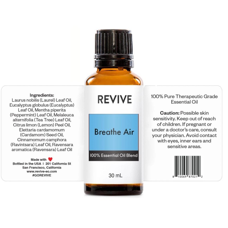 REVIVE Breathe Air is a proprietary blend of Laurel, Eucalyptus, Peppermint, Tea Tree, Lemon, Cardamom, Ravintsara, and Ravensara essential oils. Breathe Air is a great way to freshen air when diffused.