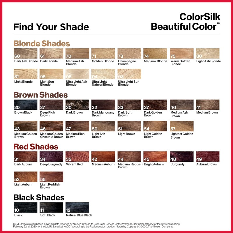 ColorSilk Beautiful Color™ is the #1 brand in the USA*. The ammonia-free hair color delivers 100% gray coverage. Achieve rich, long lasting hair color and a radiant shine at home. Revlon’s 3D Color Gel Technology™ delivers natural looking, multi-tonal color from root to tip providing definition and boosting your hair’s dimension. Hair is left feeling silky, shiny and healthy, and in better condition than before coloration. Revlon's calculations based on Nielsen ScanTrack unit sales data for U.S. Hair color category last 52 weeks ending 6/29/2019 across xAOC and Nielsen U.S. panel data FY 2018.