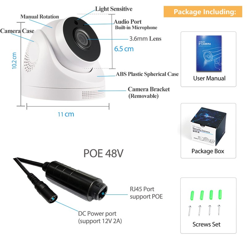 - 〖 Support POE and DC 〗Built-in POE template, support 48V 802.3af POE function, (Power over Ethernet), reduce wiring trouble. And it also has an auxiliary power interface, which can be powered by ordinary 12V 2A power supply and used as a non-POE network camera.