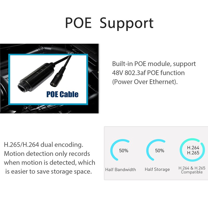 - 〖 Save storage space, H.265/H.264 double encoding 〗Compared with H.264, H.265 needs half the bandwidth to transmit the same quality image, and the same quality recording needs half the storage space. Motion detection only records when motion is detected, which is easier to save storage space than other cameras.