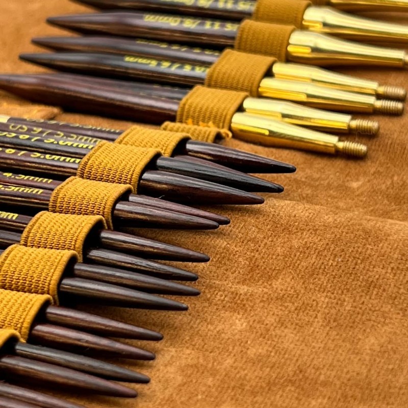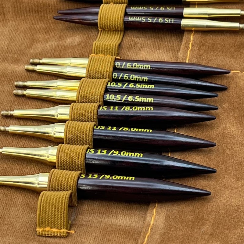 - Included: Interchangeable Circular Knitting Needle Set Contains: (10) 3.5 Inch Tip Sets: US Sizes: 4, 5, 6, 7, 8, 9, 10, 10.5, 11 & 13 | 4 Connecting Cords: 15.75 in., 19.7 in., 23.5 in., 31.5 in. | 4 Rosewood Stoppers | 1 Leather Carrying Case with Magnetic Internal Storage Pocket