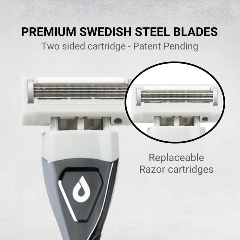 - Enjoy a long-lasting shave with our dual-sided Swedish steel cartridge razor for men—engineered to double blade life and reduce frequent replacements.