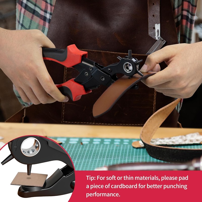 - 【Multi-function】 Ideal for use on a variety of surfaces. It is an awesome tool. The punch plier is commonly used for punching round holes in leather, belts, plastic, rubber, canvas, fabric, cardboard, saddles, and similar materials; especially useful as a leather hole punch. It has 6 different sizes, which is perfect for home hobby or commercial use. Hole size dimensions: 2mm, 2.5mm, 3mm, 3.5mm, 4mm and 4.5mm. And the six tapers are very sharp to meet the maximum demand.