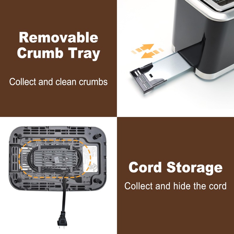 - Removable Crumb Tray for Easy Cleaning - Cleaning is quick and simple thanks to the slide-out removable crumb tray. It catches every crumb to keep your kitchen clean, while the stainless steel surface stays smudge-free and sleek.