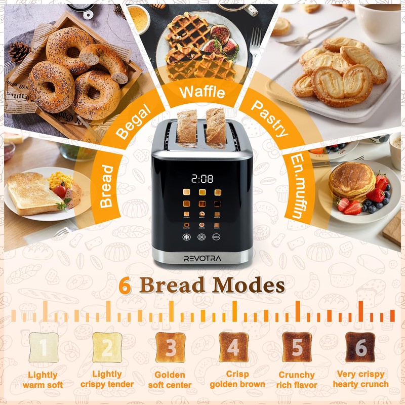 REVOTRA 2 Slice Toaster Stainless Steel with LED Display, Extra Wide Slots, 6 Shade Settings, Defrost/Reheat/Cancel, Removable Crumb Tray C Compact Toaster for Bagels & Waffles