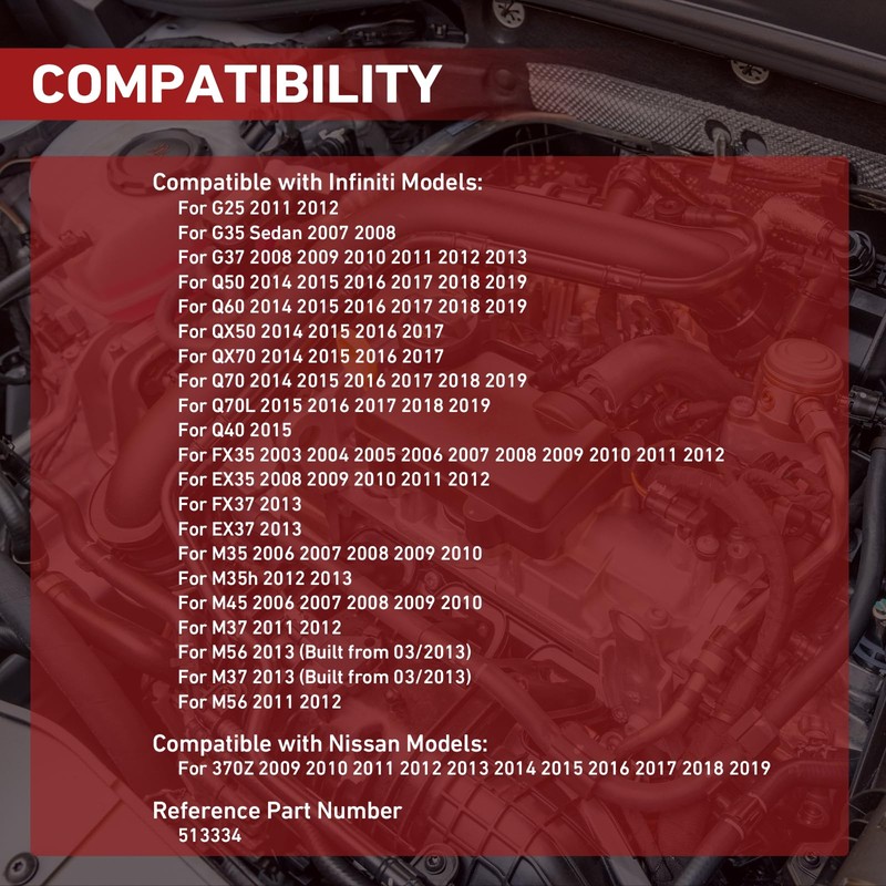 - Vehicle Fitment: Wheel hub bearing fits Infiniti G25 2011 2012, G35 Sedan 2007 2008, G37 2008 2009 2010 2011 2012 2013, Q50 2014 2015 2016 2017 2018 2019, Q60 2014 2015 2016 2017 2018 2019, QX50 2014 2015 2016 2017, QX70 2014 2015 2016 2017, Q70 2014 2015 2016 2017 2018 2019, Q70L 2015 2016 2017 2018 2019, Q40 2015, FX35 2003 2004 2005 2006 2007 2008 2009 2010 2011 2012, EX35 2008 2009 2010 2011 2012, FX37 2013, EX37 2013, M35 2006 2007 2008 2009 2010, M35h 2012 2013, M45 2006 2007 2008 2009 2010, M37 2011 2012, M56 2013 (Built from 03/2013), M37 2013 (Built from 03/2013), M56 2011 2012; Fits Nissan 370Z 2009 2010 2011 2012 2013 2014 2015 2016 2017 2018 2019.