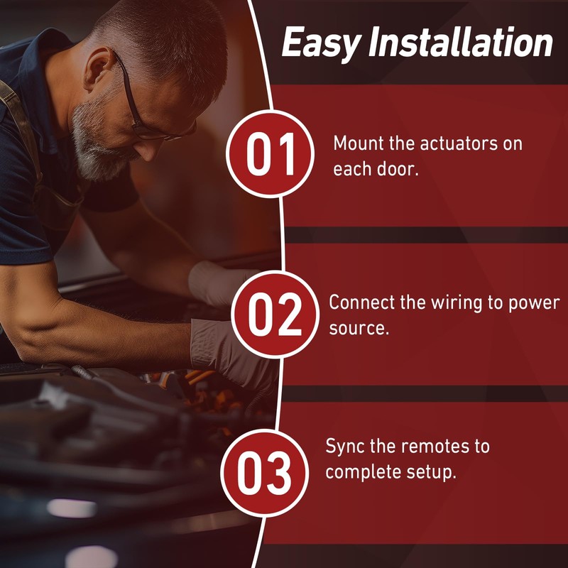 - Complete Installation Kit: Includes 4 x door lock actuators, 2 x remote controllers, 1 x control box, 1 x wiring, 1 x installation accessories, and an English user manual for straightforward setup.