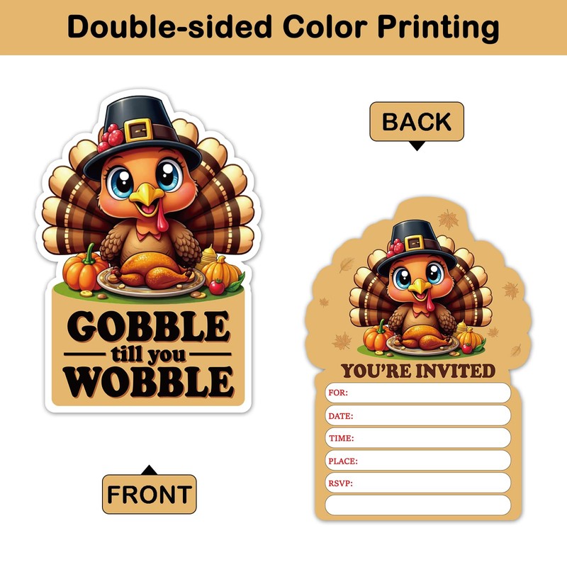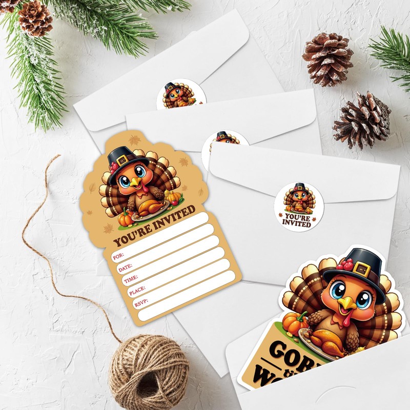 - Thanksgiving Party Invitation Sets: There are 15 turkey shaped invitation cards, 15 premium white envelopes and 15 matching envelope seal stickers in this package. These beautiful invitations will make your party the talk of town and make the guests excited to come and participate