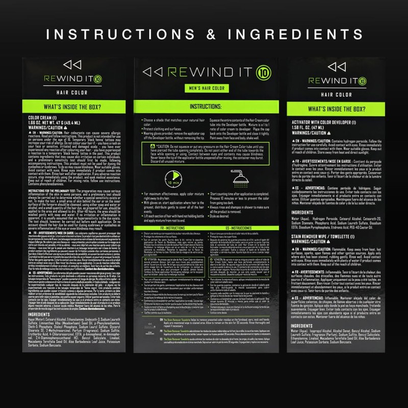 Turn back the clock on grays and show off deep jet-black hair with strong staying power. REWIND It 10 makes it simple to be the real you inside and out by restoring rich, natural-looking jet-black color to every type of hair. The intense color cream that saturates each strand for color that lasts through sports, swimming, and repeated washing. In just 5 - 10 minutes, you can revive your look and eliminate grays with color that lasts without fading until new hair grows in.