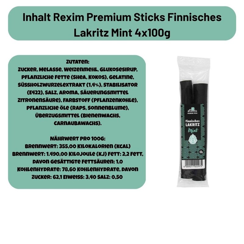 Rexim Premium Sticks Finnisches Lakritz Mint 4×100 g | Weiche Lakritz-Stangen mit Minznote | 4er Vorratspack (insg. 400 g) | Intensiv & erfrischend | Snack für unterwegs & Büro