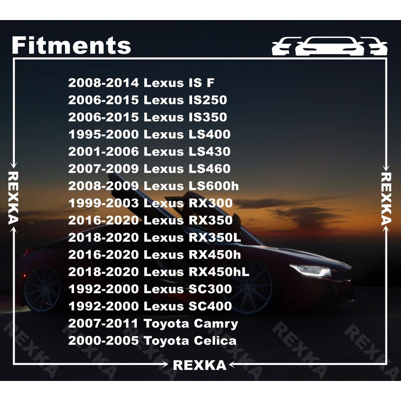 • 🚗 This Kits Usually fits Fender Liner, Bumper Cover, Splash Shield for Lexus: IS F, IS250, IS350, LS400, LS430, LS460, LS600h, RX300, RX350, RX350L, RX450h, RX450hL, SC300, SC400; Fits: Toyota: Camry, Celica