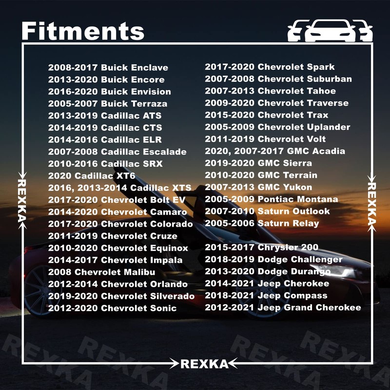 - Replaces GM: 11571175, Fits uick: Enclave, Encore, Envision, Terraza; Cadillac: ATS, CTS, ELR, SRX, XTS; Chevrolet: Bolt EV, Camaro, Colorado, Cruze, Equinox, Impala, Malibu, Orlando, Sonic, Spark, Suburban, Tahoe, Traverse, Trax, Uplander, Volt; GMC: Acadia, Terrain, Yukon, Pontiac: Montana, Saturn: Outlook,Relay; Chrysler: 200 Jeep: Cherokee, Grand Cherokee