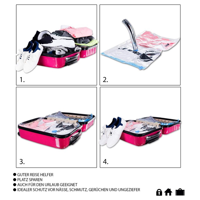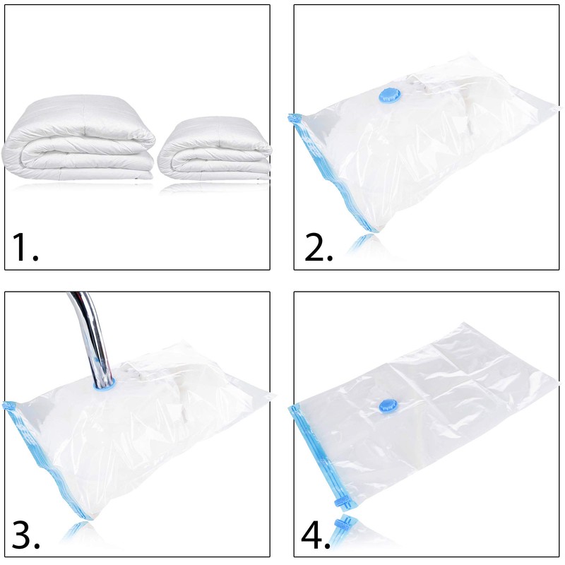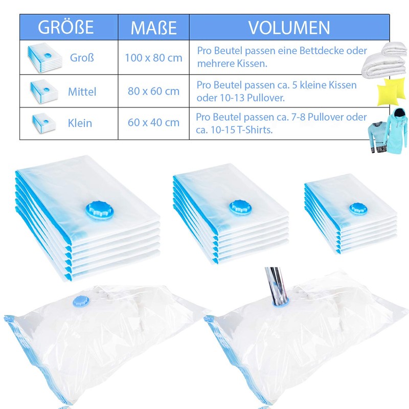 - Space-saving: thanks to the vacuum bag, you finally have space in your cupboard, or in your suitcase when travelling. The space required for your towels, bed linen, pillows, jackets, sweaters, plush toys and other textiles can now be reduced by up to 75% thanks to the vacuum bags. You will be absolutely amazed by your new storage space.