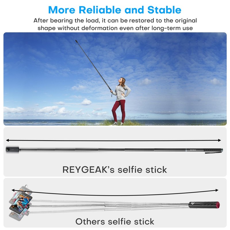 • 【Invisible Selfie Pole Application】REYGEAK's Extended Handheld Selfie Stick Design (Upgrade 3m/118") is suitable for party events, family gatherings, camping, skiing, snowboarding, skateboarding and cycling. It is suitable for riding or skating on the ice lake, or expanding your adventurous selfie range while hiking. It's also an ideal present for your friends and lovers
