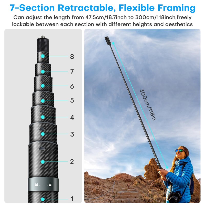 • 【Easy to Use】When you need to use the invisible selfie pole, please rotate it counterclockwise to release it and select the required length. On the contrary, rotate it clockwise to lock it. It can be extended to 118 inches (300cm) to bring a new perspective. The folded size is 47.5cm (18.7 inches) and the weight is 307g (0.67 pounds).